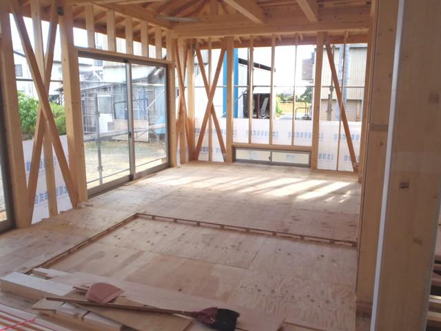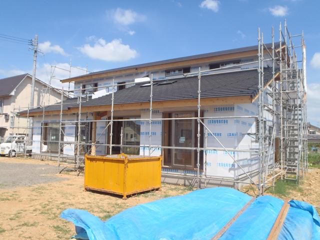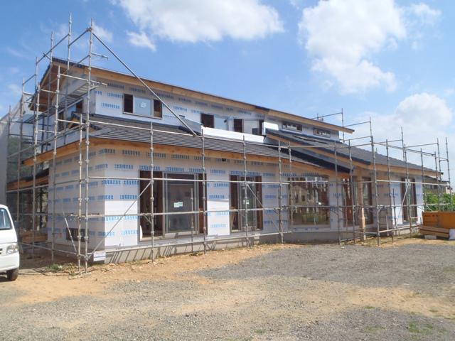 先週の工事 サッシ・ガラスが取付けられました! 30日には検査機構のJIOの中間検査があり、合格いたし ました。 外部には防湿シートが張られました。