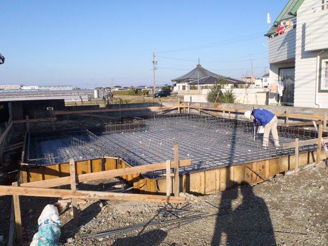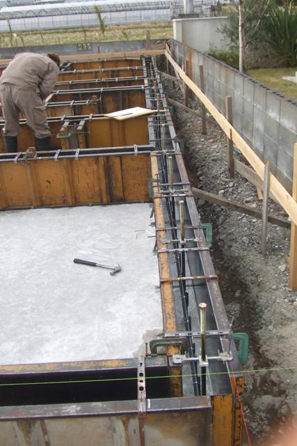 基礎工事、鉄筋を組み終えJIOの配筋検査を受け合格となりました!型枠を作りコンクリート打ちを行い、型ばらしを行いました。