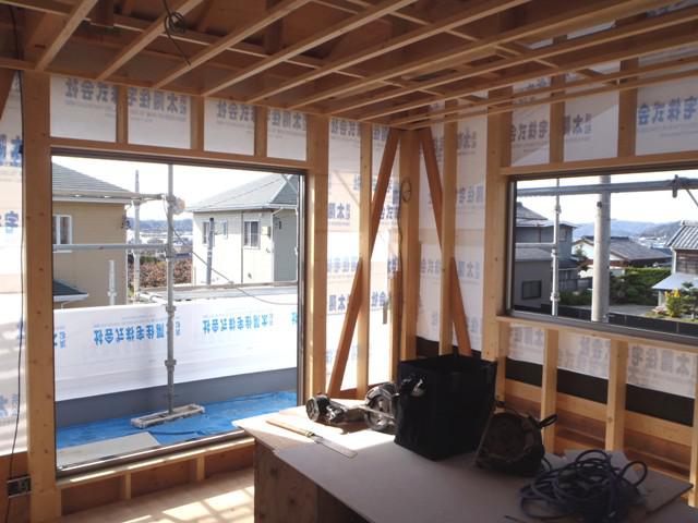 ☆先週の工事☆ 木工事(軒天下地組み及びケイカル板貼り、外壁下地打ち、 2階断熱材入れ、天井ボード貼り、他) ユニットバス据付 JIO外装下地検査 ☆今週の予定工事☆ 木工事(2階断熱材入れ、天井ボード貼り、1階天井下地組み、 他) 外壁工事(サイディング下地、サイディング貼り)