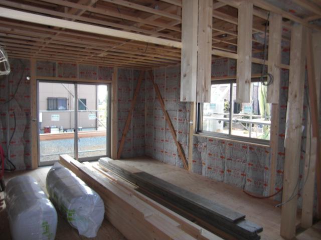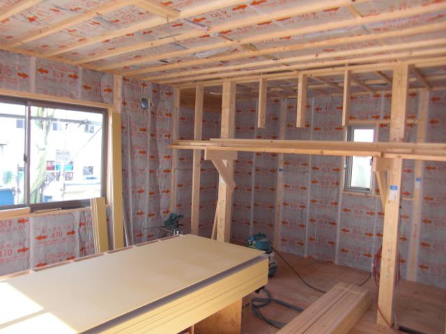 ☆先週の工事☆ 木工事(壁断熱材入れ、天井断熱材入れ、天井ボード貼り、他) 外装下地検査 ☆今週の予定工事☆ 木工事(軒天下地組み及びケイカル板貼り、外部胴縁打ち、床ボード貼り)他