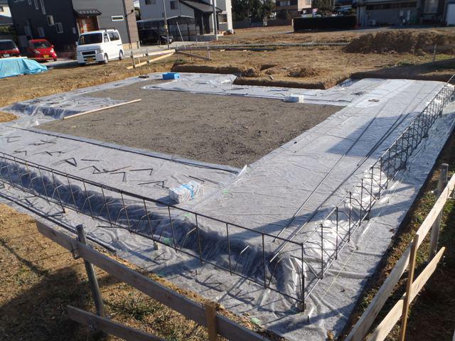 基礎工事で土間シートが貼られています(これは基礎下から湿気を防ぐ役割があります)今週の中旬から鉄筋組みに入って行きます!