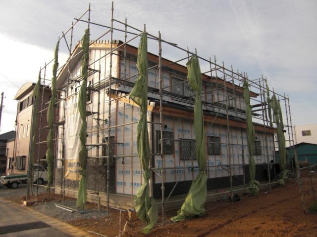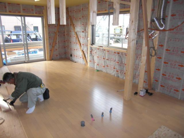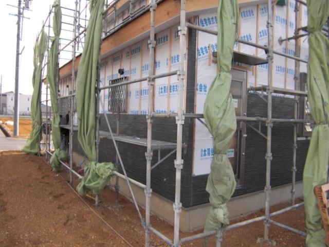 先週から外壁工事に入りました!下はチャコールグレーで落ち着いた感じです。出来上がりが楽しみです。内部は大工さんがフローリングを丁寧に施工しております。