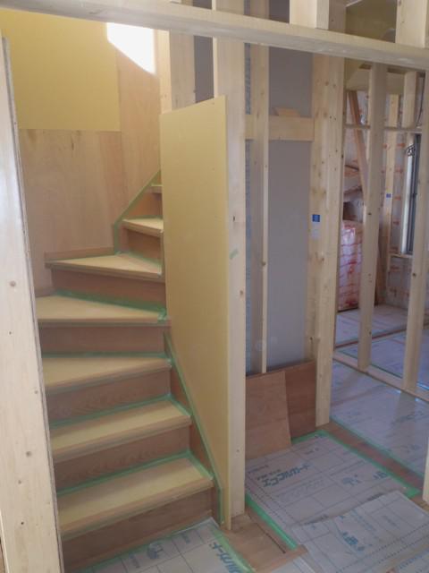 内部大工工事が進み室内階段が取付られました!外壁工事も天候に左右されながら進めています。