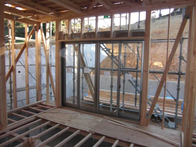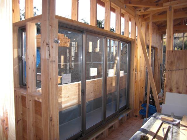 大工工事、サッシ取付け終わり障子も入りました!先週躯体検査(骨組みや金物の検査)を行いまして、無事合格致しました!