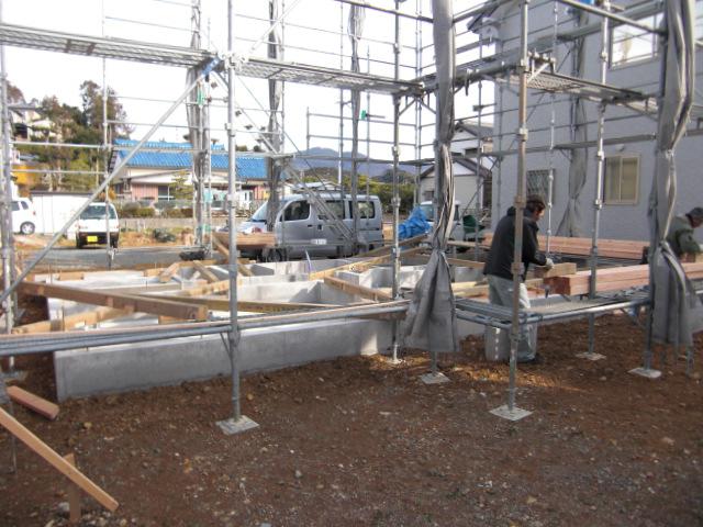 外部足場、土台が据え付けられまして上棟準備が進められております!いよいよ上棟です!