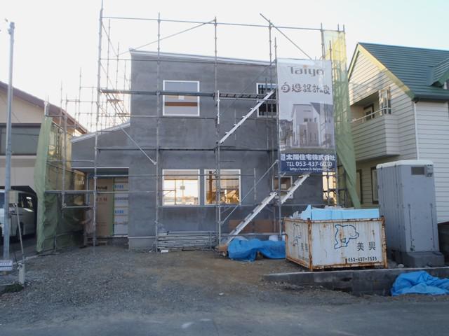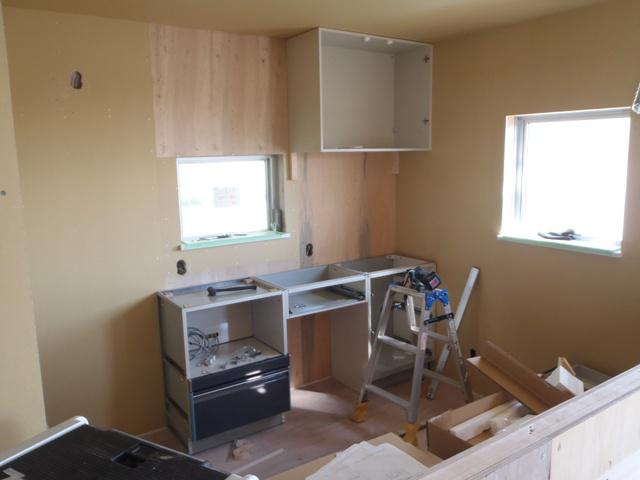 ☆先週の工事☆ 木工事(床無垢フローリング貼り、壁ボード貼り、棚類取付 ユニット建具吊込み、他) 外壁工事(ベースコート養生、仕上げジョリパット塗り) 板金樋工事 キッチン据付 換気扇フード類取付 ☆今週の予定工事☆ 内装仕上げ工事(クロス下地、クロス貼り、ビニール床シート CF貼り) 外部給排水埋設、外壁仕上げ(ジョリパット塗り)
