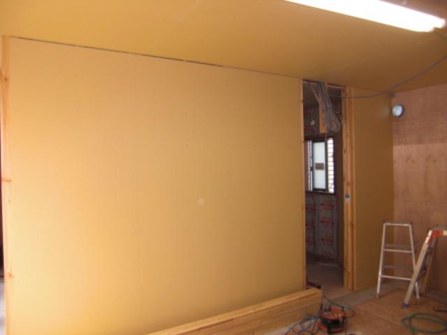 外壁工事も終盤に近付いております。内部は大工さんにより壁ボードが付けられております。