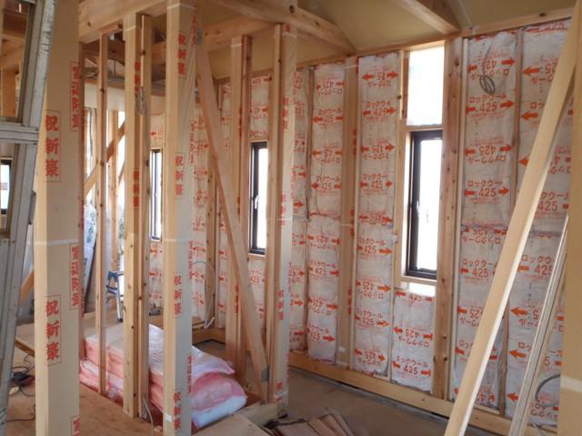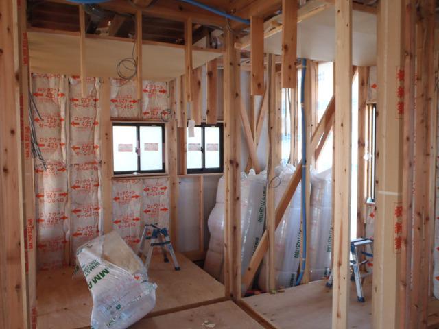 ☆先週の工事☆ 木工事(天井下地組み、天井断熱材入れ・ボード貼り、 2階床下地ボード貼り、他) 外壁工事(サイディング下地、サイディング貼り) ユニットバス据付 ☆今週の予定工事☆ 木工事(2階床下地ボード貼り、床フローリング貼り、 窓枠取付、他) 外壁工事(サイディング貼り)