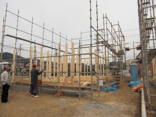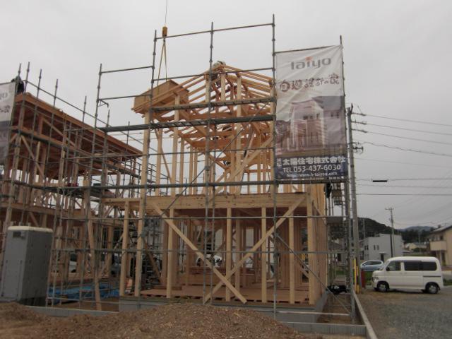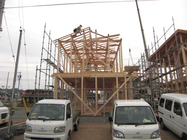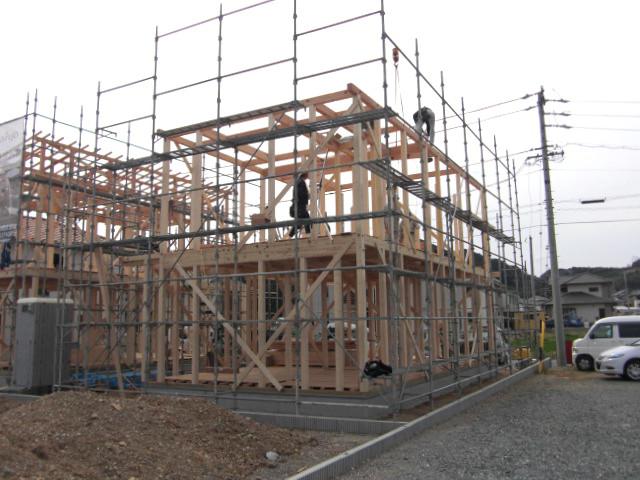 ☆先週の工事☆ 上棟準備 上棟 木工事(筋カイ・間柱入れ、構造金物取付、他) 外部足場組 下屋カラーべスト葺き 構造材、下地材搬入 ☆今週の予定工事☆ 木工事(構造金物取付、2階床下地組み、ベランダ下地 組み、他)