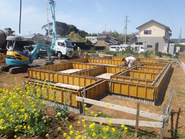 基礎ベース型枠を解体し、立ち上がり部分型枠組み、ボルト類設置し、コンクリート打ちを終え養生し型枠解体及び埋め戻しを行いました。