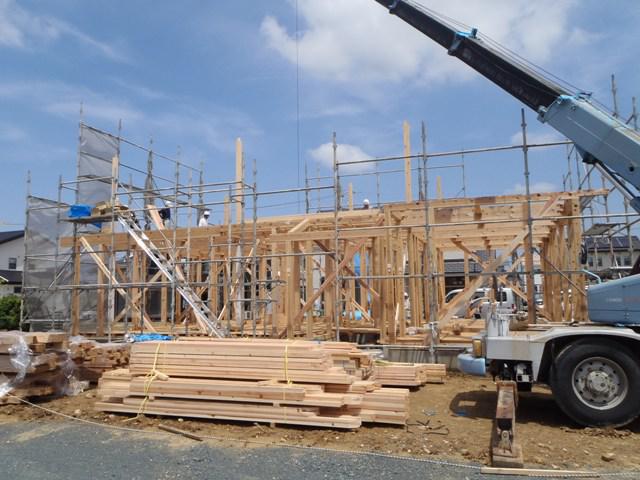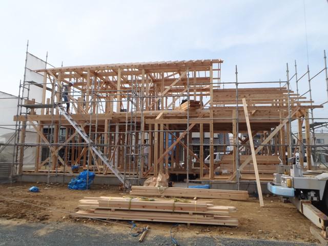 M様上棟おめでとうございます!!天気も良く立派に棟上げができました!地元材を使った構造部材は綺麗に配置され、無垢の香りがとてもいい感じです。これから日を増すごとに工事が進んでいきますので楽しみですね!