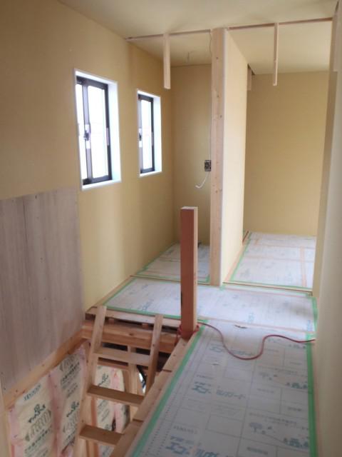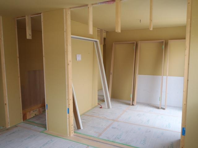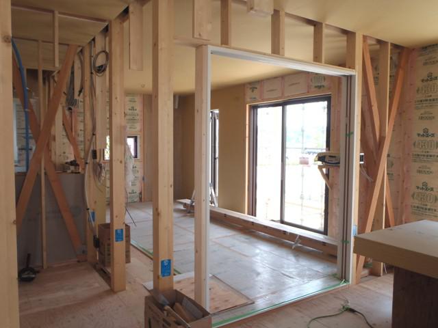 大工工事が進みまして、壁下地が入っています!土地(53.66坪)建物(29.69坪)オール電化・照明・カーテン・太陽光発電・税込価格、2,192万円で販売も開始しました!お気軽にお問い合せ下さい。