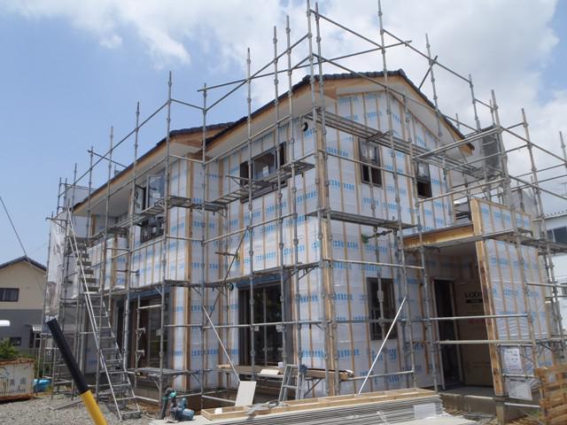 外壁工事が進んでおります。防火サイディングが約5割が完了しました!内部には二階のフローリングが貼られ始めました。