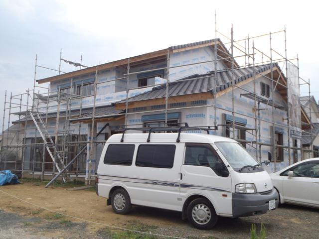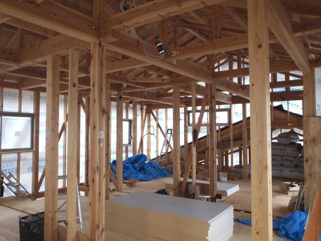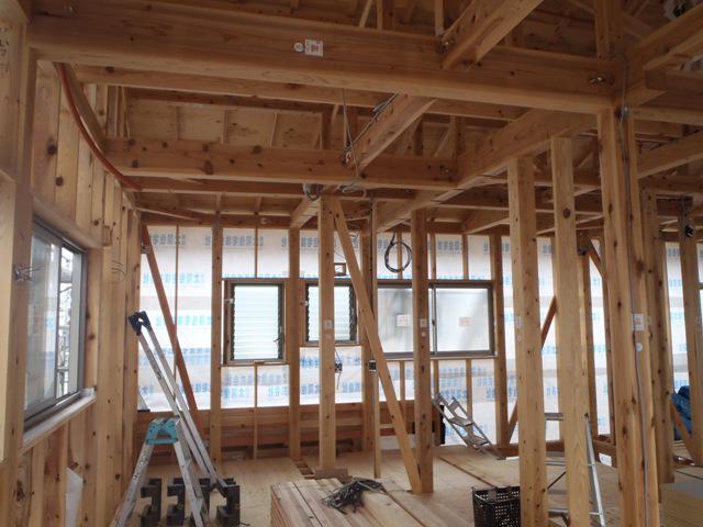 先週の台風が心配でしたが、外壁下地シート貼りが完了し構造材や下地木材を雨に濡らす事がなくなり、内部造作を進めれる様になりました!今週も内部工事を進めて行きます。