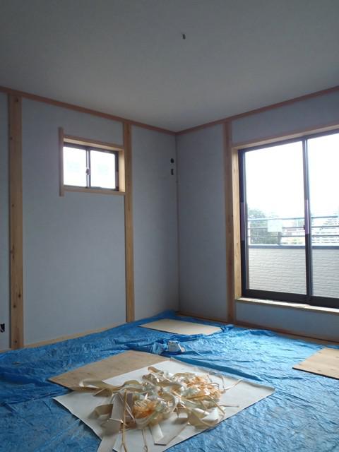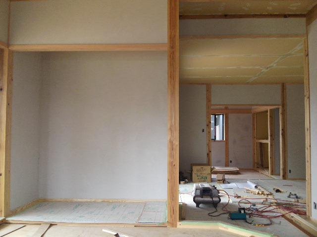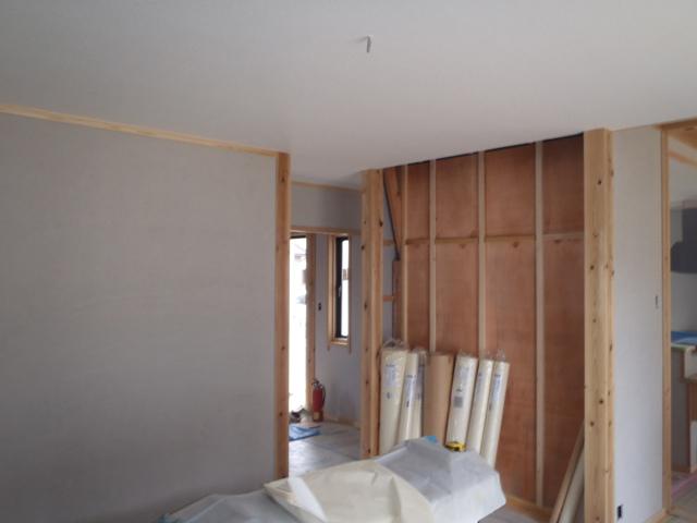 ☆先週の工事☆ 左官工事(壁珪藻土、下塗り、上塗り) 内装工事(クロス下地、クロス貼り) ☆今週の予定工事☆ 左官工事(壁珪藻土、上塗り) 内装工事(クロス貼り、 クッションシート貼り) 玄関・ポーチタイル貼り 衛生器具・電気器具付け