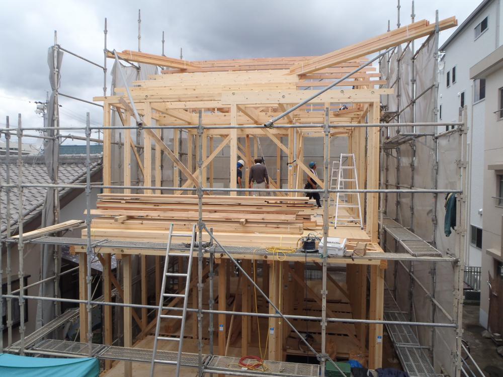 ☆先週の工事☆ 上棟 木工事(筋カイ・間柱入れ、構造金物取付、他) 屋根工事(瓦下地、荷揚げ、瓦葺き) ☆今週の予定工事☆ 木工事(床下地、サッシ開口、他) 屋根工事(瓦葺き)