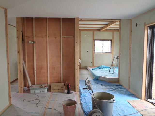 ☆先週の工事☆ 左官工事(壁珪藻土、上塗り) 内装工事(クロス貼り、クッションシート 貼り) 玄関・ポーチタイル貼り 衛生器具・電気器具付け ☆今週の予定工事☆ 電器器具付け 養生仕上げ・ハウスクリーニング 製作家具・建具入れ