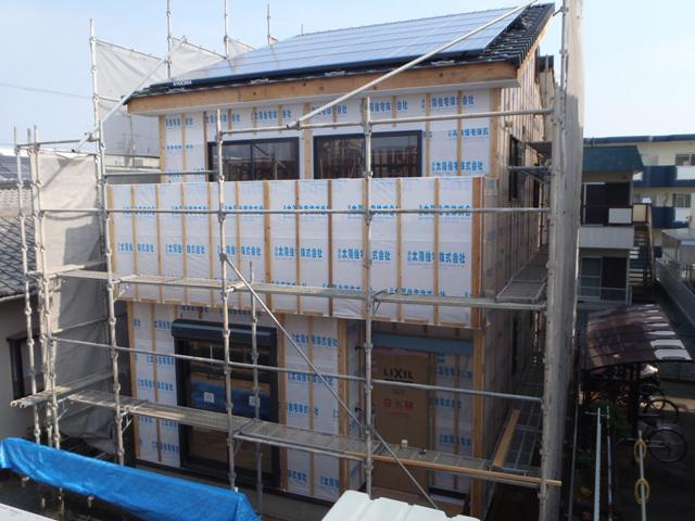 先週より電気配線工事に取り掛かっております!JIOの外装下地検査(防水検査)を行いました。太陽光パネルも屋根に乗りました!