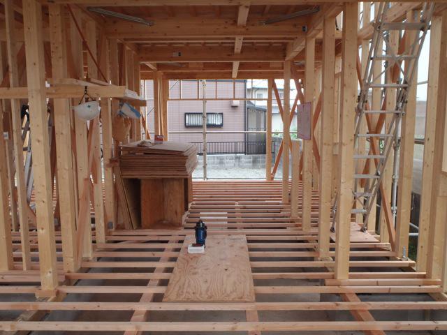 ☆先週の工事☆ 木工事(ベランダ下地、サッシ開口造作、2階天井下地組み、 他) 防腐防蟻処理 ☆今週の予定工事☆ 木工事(サッシ取付、2階天井下地組み、1階床下地本締め、 他) 保証機構、構造検査
