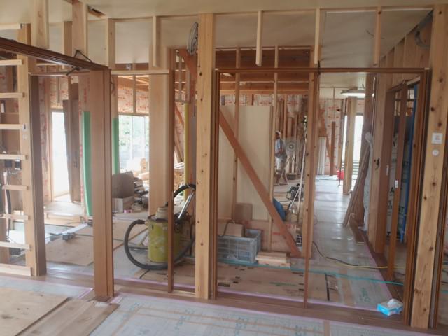 外部工事、給排水、雨水管埋設を進めております。左官工事、基礎幅木化粧モルタル塗りを行いました。 木工事も床無垢フローリング張りを終え、ドア枠開口枠を取り付けながら、壁下地(胴縁)打ちを進めております。