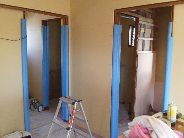 ・木工事、ドア開口枠、壁下地(胴縁)取付をし、壁ボード貼りが