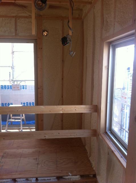 ・18日保証機構(JIO)外装下地検査(外壁シートの貼り重ね長さ、 シート貫通部の防水部の防水処理)に合格しました。 ・天井、壁断熱材工事、窓、コンセントBOX類、化粧材を養生し、 ウレタン発泡材を隙間なく充填され完了しました。 今週の火曜日にはユニットバスが搬入・施工を予定しています!