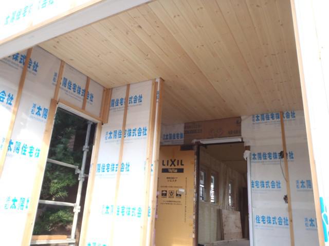 先週より外壁工事へと入っております!木工事では玄関ポーチの天井にパイン材が張られましてとてもいい感じに仕上がっています。 今週は天気が心配ですが、外壁工事・内部大工工事を引き続き行って行きます。
