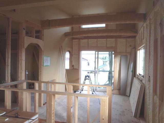☆先週の工事☆ 木工事(軒下、化粧材貼り、壁ボード貼り、床無垢フローリング貼り 開口造作、他) 土台水切り取付、外壁下地 ☆今週の予定工事☆ 木工事(床無垢フローリング貼り、床養生、開口造作、他) 外壁工事(コーナー材取付、平部サイディング貼り)