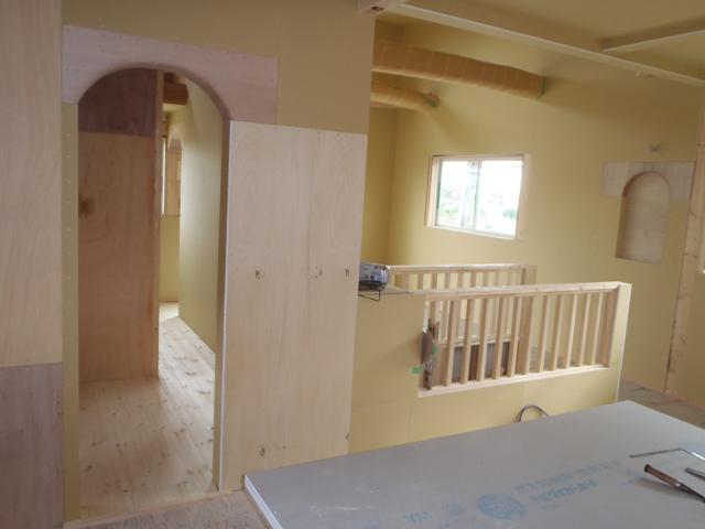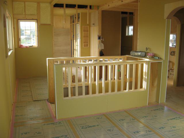 外壁工事、サイディングを張り終えコーキング打ちへと入って行きます。内部、大工工事では床にムクのフローリング材が施工されてきています。ムクは傷つきやすいので養生シートでしっかり保護していきます。