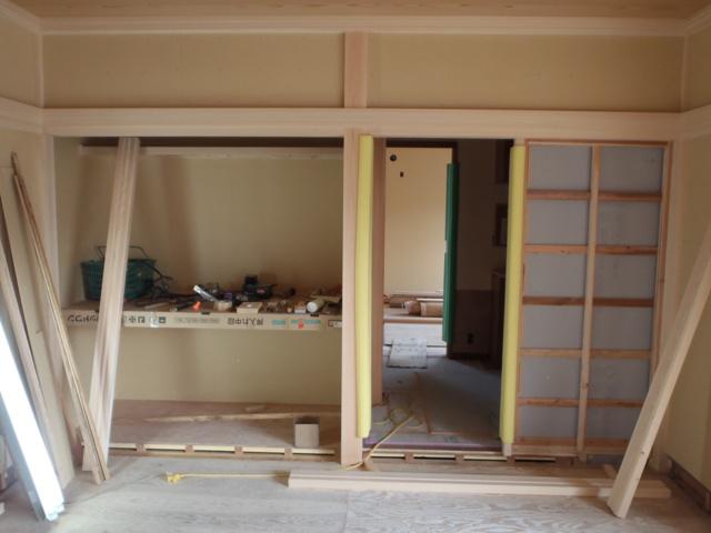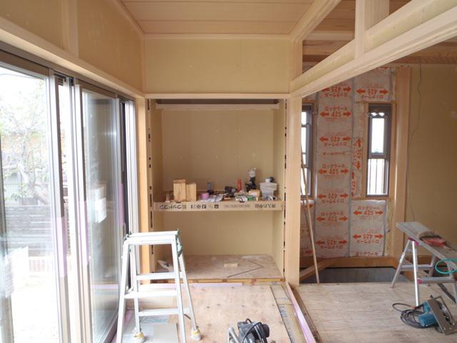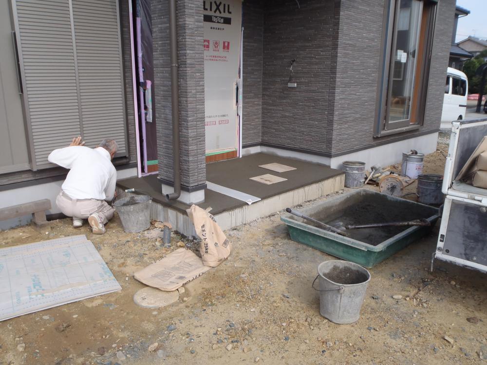 外部工事、玄関タイルの下地を作りタイル貼りへと進めております。内部大工造作は和室を中心に進めています。