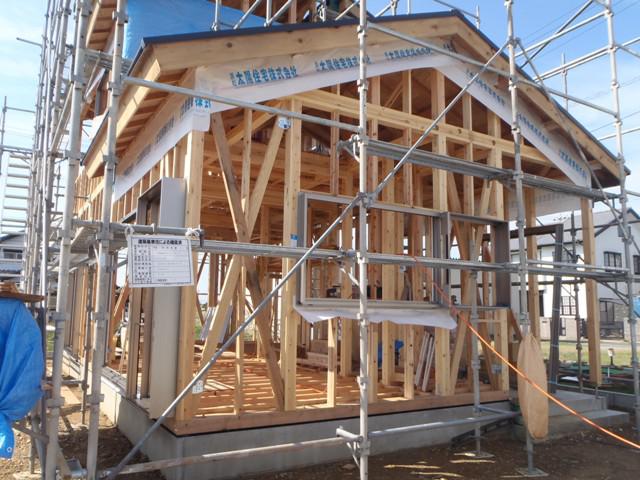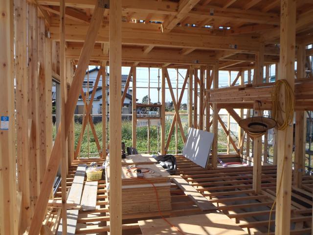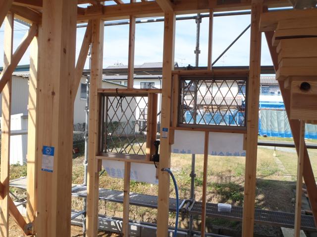 ・検査機構、保証機構、中間検査に合格しました。 ・木工事、2階天井下地組み、サッシ取付と進め軒天(軒下) 下地組み及び化粧板(ケイカル板)を予定しています。