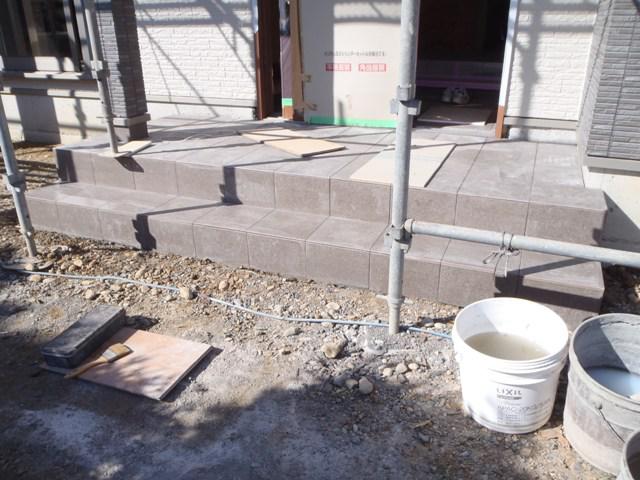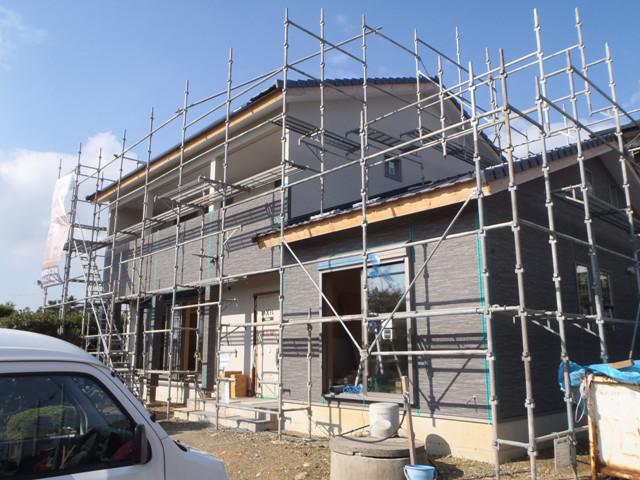 ・内部木工事、和室造作を終え、1・2階内部造作と進めて います。 ・玄関・ポーチタイル工事も仕上がり、玄関周りが華やかに なりました。 ・外部工事、軒天塗装が完了し、板金・トイ工事、TVアンテナ 取付に入ります。