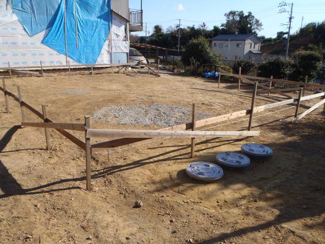 ・地盤調査の結果報告書より、しっかりと地盤強度が確認できました。22日より基礎工事に着手し、丁張(基礎の基準となる位置、高さ出し)を行い、掘削・砕石地業と進めています。
