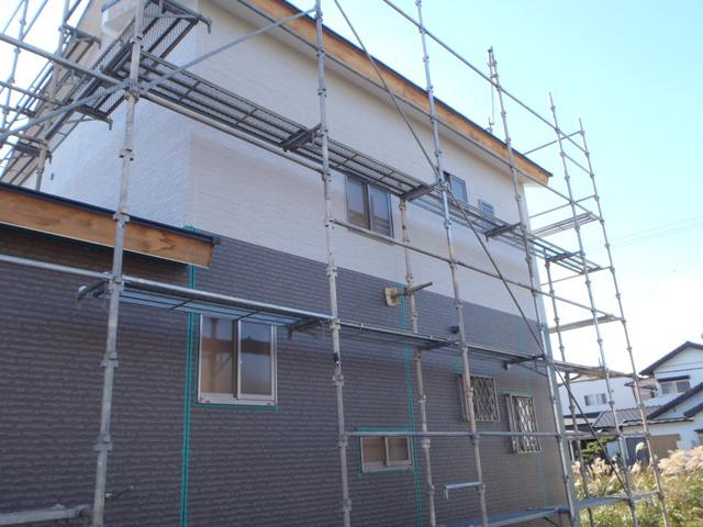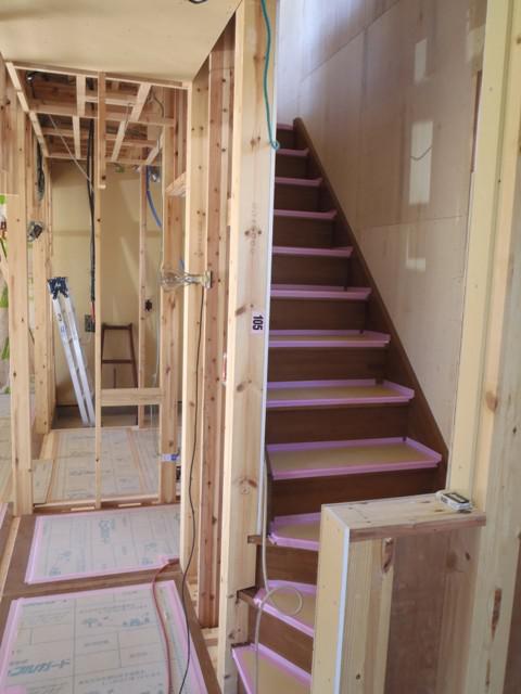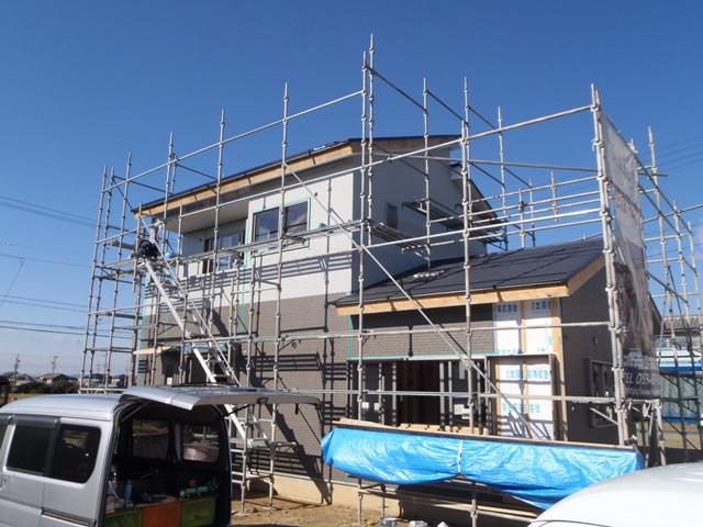 ・木工事、階段造作が完了し、2階壁ボード、下地合板貼りが 進められ、各部屋が間切られてきました。 ・外壁工事、平板サイディング貼りを進め、コーキング打ちへと 入っていきます。コーキング材が乾き次第、軒天塗装に入り ます。