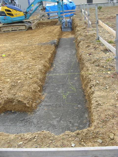 基礎工事、掘削部分を砕石にて不陸調整・転圧し土間シート(地中からの湿気を防ぐシート)敷きを進めております。 この後、鉄筋加工、鉄筋組み、ベース型枠を予定しております。