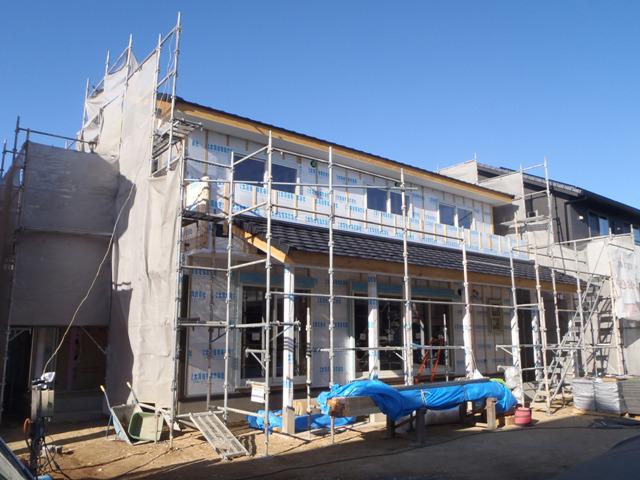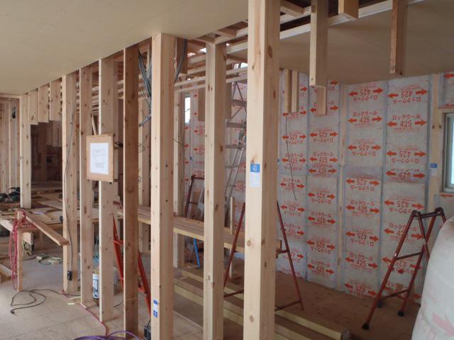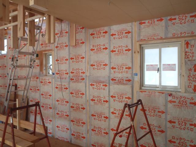 を行い2階天井下地組み、壁断熱材入れを進めていきます。