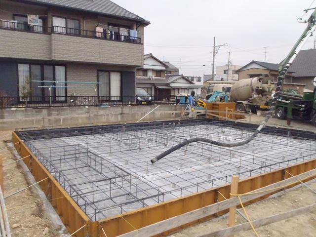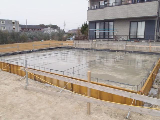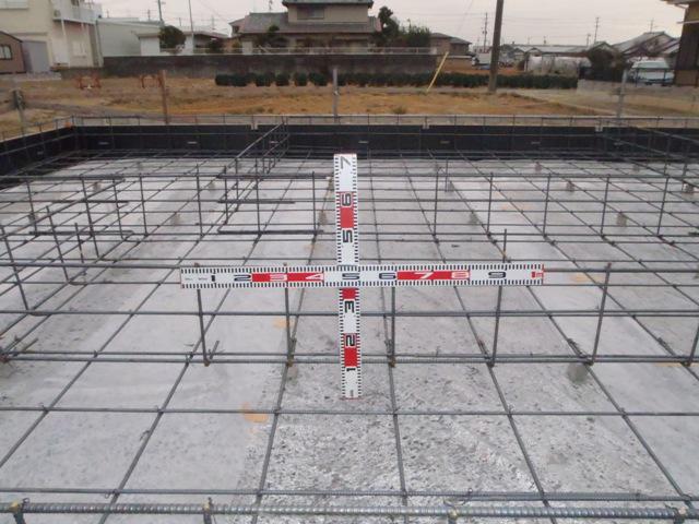 基礎工事が進んでいます。鉄筋組みを行いまして保証機構JIOの配筋検査(コンクリートの骨組みとなる鉄筋組み状況、コンクリートと鉄筋との幅等)検査合格しベースコン打ちをしました。