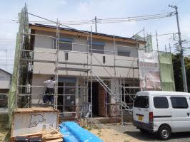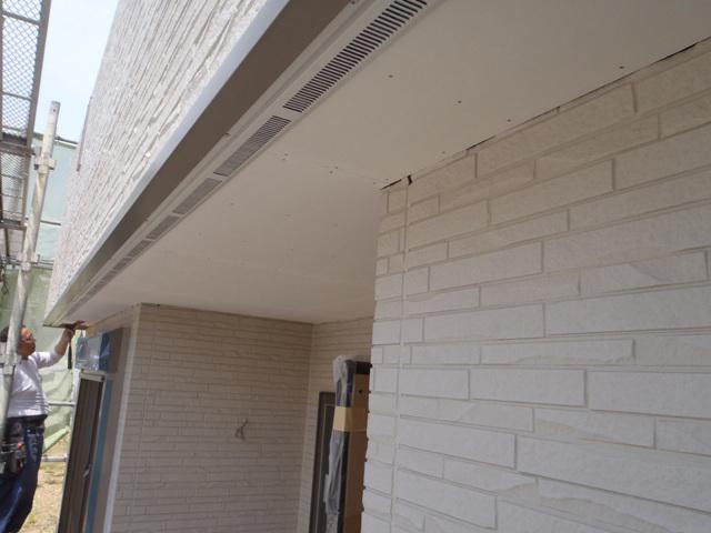 ・木工事・外部・軒天下地組み、ケイカル板貼りを進めています。 内部も建具吊込みを行えば、木工事完了なります。 ・外部・軒天・外壁取り合い部コーキング打ち、軒天塗装、 板金工事へと進めていきます。