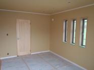 ・木工事、棟梁濱井さんが腕を揮いまとめて頂き完了となり ました。内装工事へと進めていきます。外部工事、外壁コーキング 残りを打ち終え、軒天塗装、板金・樋工事を行っています。 来週、換気扇フード類外部器具、TVアンテナ取付を行い、 外部足場解体となります。