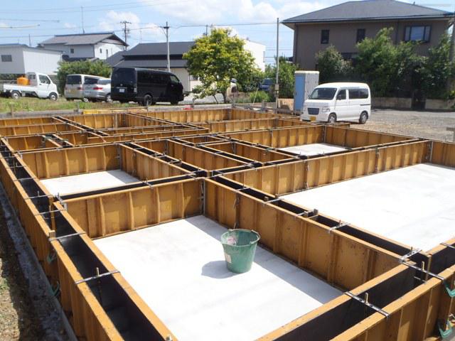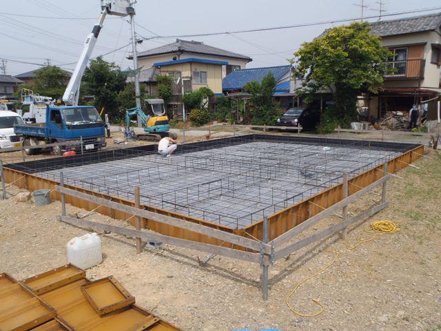 後、ベースコンクリート打ち、立ち上り型枠組み、アンカーボルト類を