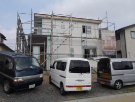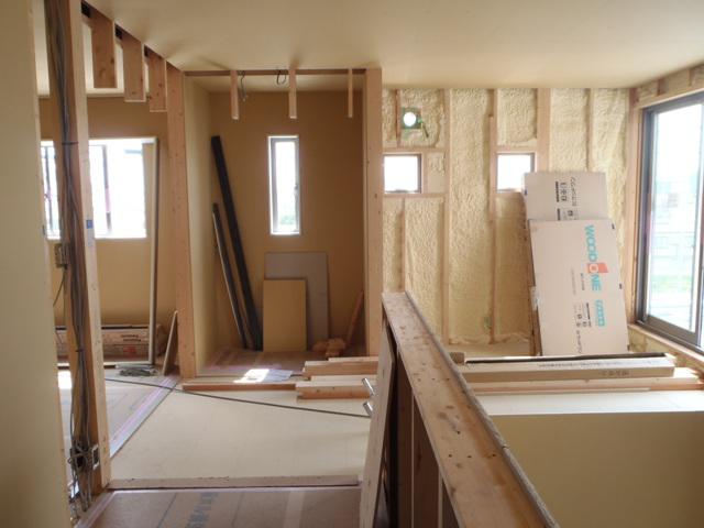・外壁コーキング工事が完了し、軒天(軒下)塗装に入ります。 ・内部木工事、LDK・玄関フローリング・框取付をし、天井ボード 貼り、1階ドア開口枠取付けながら、壁ボード・下地合板貼り を進めています。