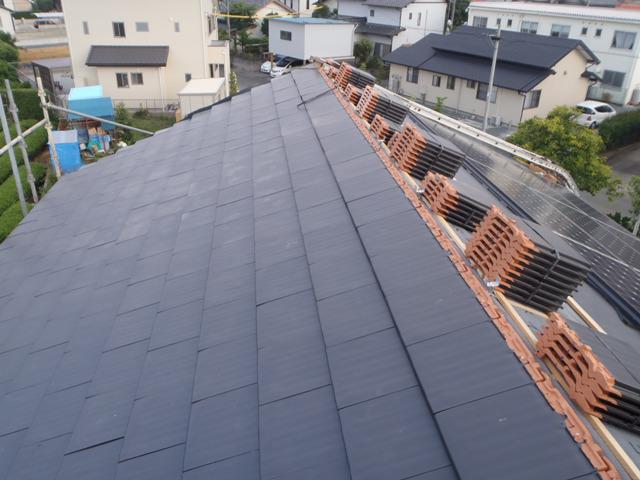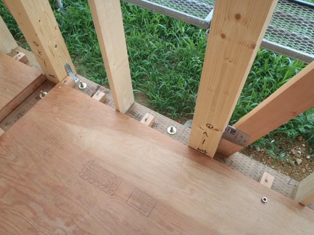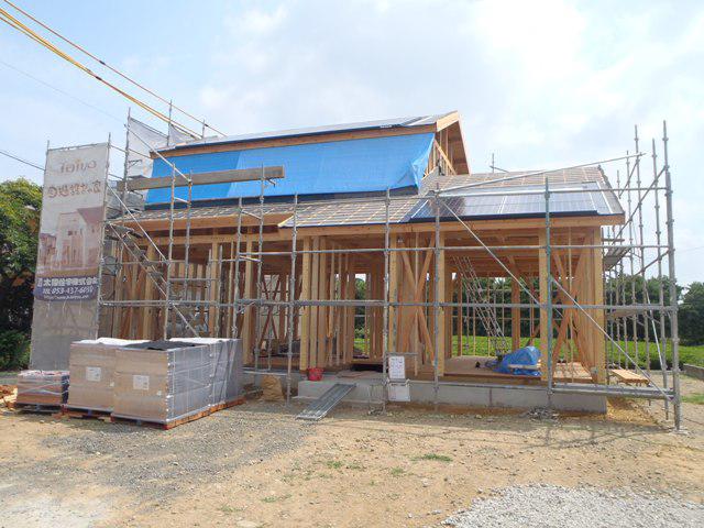 ・屋根工事、屋根下地材を取付、瓦葺きを行っています。 瓦加重が構造材にしっかりと掛かりました。 ・木工事、ベランダ下地造作、構造材、耐力壁(斜材)の構造金物 取付を行っています。