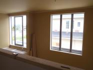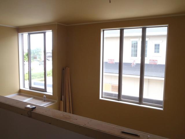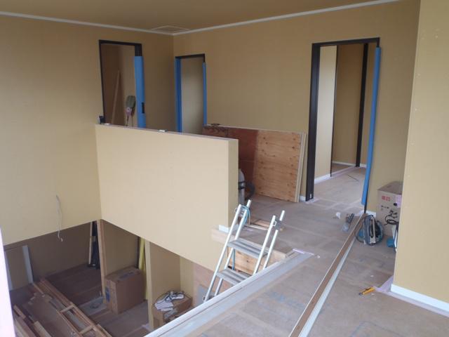 ・外部足場が解体され建物外観がよく確認出来るようになり ました。 外部給排水埋設を進めています、内部木工事・ 間仕切り壁が完了し、幅木・廻縁取付・収納内棚板取付を 進めています。