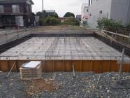 ・基礎工事、基礎骨組となる鉄筋を組みあげ、保証検査機構JIO 配筋検査、鉄筋組み状況、コンクリートと鉄筋との間隔など立会い 確認検査しベースコンクリート打ち、布部立ち上がり型枠組み、 ボルト類設置し立ち上がり部コンクリート打ちまで行いました。