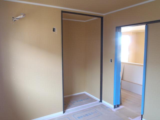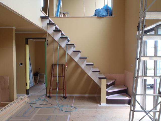 内部木工事、階段造作が完了し、建具吊込みを行っています。 外部左官工事、勝手口造成、エコキュートベースコンクリート、基礎幅木 塗りを完了しました。
