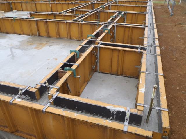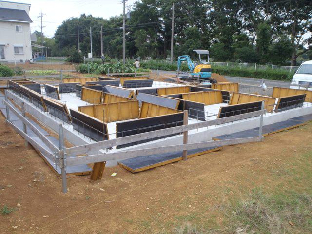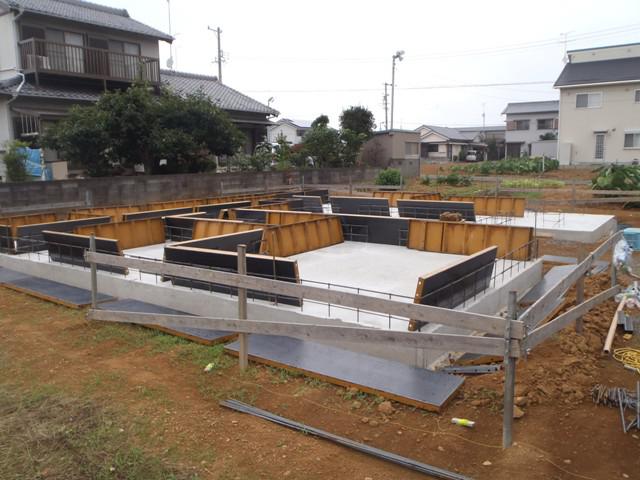 ・基礎工事、立ち上り部型枠組み、アンカーボルト類設置、コンクリートを 打ち終え、養生中です。 ・来週、型枠を解体し、基礎周り埋め戻し整地、玄関・ポーチタイル 下地コンクリート打ちをし、基礎工事完了となります。
