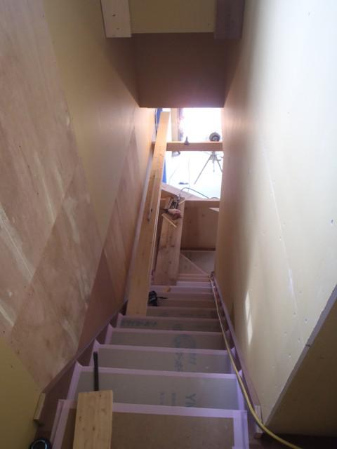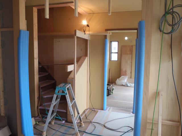 ・外部工事、板金・樋掛け、TVアンテナ・換気扇フード類を 取付け、外部足場解体作業に入ります。 ・内木工事、階段造作を終え、階段廻り、2階ドア枠取付、 壁ボード貼りと進め、収納内・棚類取付け、幅木・廻し縁取付 を行っていきます。