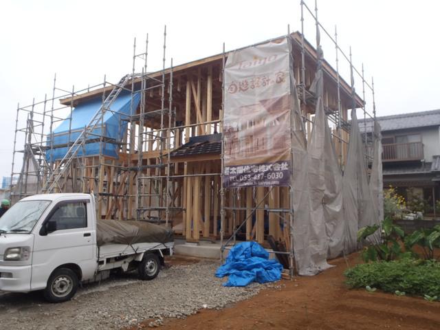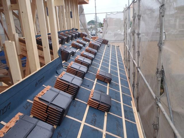 ・屋根瓦荷揚げし、瓦葺きを進めています。瓦材重量がしっかり