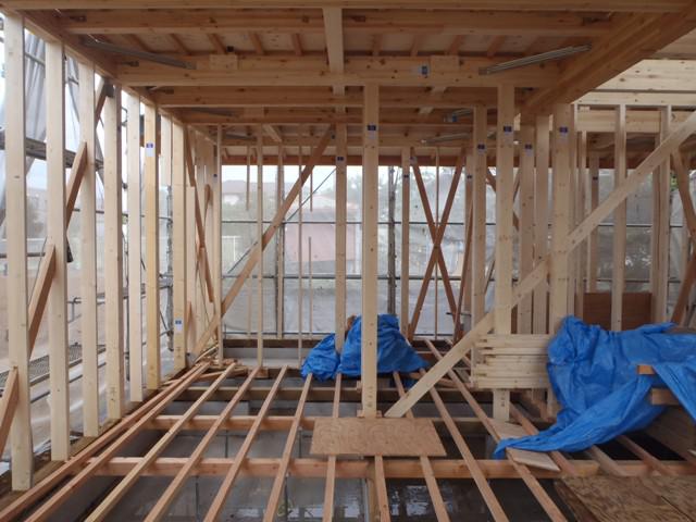 ・木工事、耐力壁となる筋違・間柱を入れながら、構造金物取付