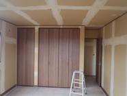 ・内部木工事・和室造作を終え、棟梁・鈴木さんに腕を揮って 頂き木工事をまとめて頂きました。 ・内装仕上げ工事に取り掛かり、下地処理、ボードジョイント・ ビス頭にパテを入れ、下地調整し、2階よりクロス貼りを 進めています。